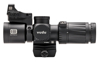 The super short Vudu 3-9x32 might be the perfect optic. Built from aircraft-grade aluminum, it's lightweight, durable, and just 6.8" long. This second focal plane scope is fog, water, and shock resistant, with capped turrets and a rotary dial for 10 brightness levels. Powered by a CR2032 battery for up to 300 hours, it features an integrated base compatible with mini-ACOG mounts.