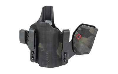 An ergonomic, mission-adjustable, RDS-compatible, multi-positional, deep concealment IWB hybrid thermoplastic holster. Its distinctive features enable concealed carry for a wide range of handgun fits from various carry positions while allowing a full firing grip prior to drawing. The design includes passive retention and adjustable tension, enabling a finely tuned fit and smooth draw. This evolution of the IncogX features a series of clips that provide more adaptability to the user while maintaining the original goals of improved grip, concealment, and function. The clips open outward and slide down with the holster, naturally locking over the belt. An actuated finger tab flexes to open, allowing quick installation or removal from the belt. An improved clip strut design combines functionality with customized concealment shims that can be easily installed or removed without tools. All IncogX models come with clip strut shims in three different concealment sizes: 1/8", 1/4", and 3/8".
