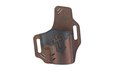 Versacarry's Guardian holster is perfect for those looking to carry everyday and maintain comfort. This leather holster is two tone black and brown with a cross logo. The holster features 1.5" belt loops and a forward cant to securely carry your holster provide a smooth draw.